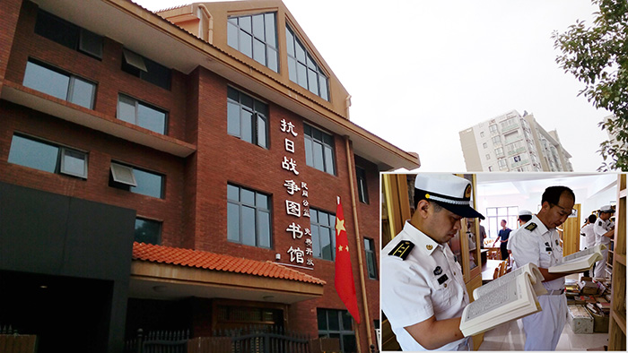 湖南炎德文化實(shí)業(yè)有限何譽(yù)軍創(chuàng)建的抗日戰(zhàn)爭圖書館。右下圖為海軍某部官兵到抗日戰(zhàn)爭圖書館參觀學(xué)習(xí)。