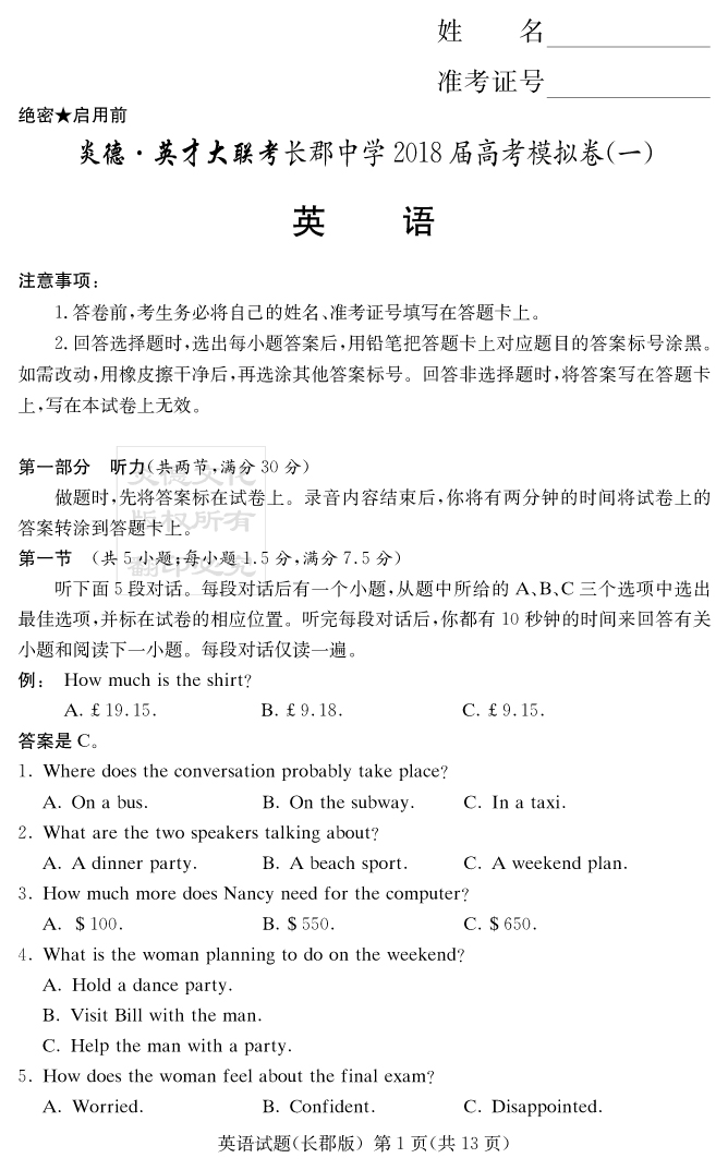 【英語】炎德英才大聯(lián)考2018長郡中學(xué)高三9次月考(模擬一)