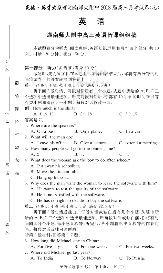 【英語(yǔ)】炎德英才大聯(lián)考2018師大附中高三7次月考
