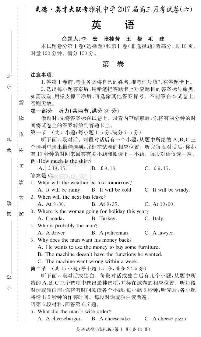 【英語】炎德英才大聯(lián)考2017雅禮中學(xué)高三6次月考