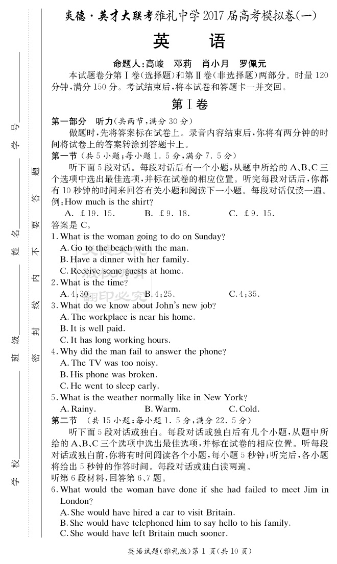 【英語】炎德英才大聯(lián)考2017雅禮中學(xué)高三8次月考(模擬一)