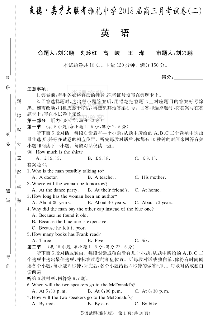 【英語(yǔ)】炎德英才大聯(lián)考2018雅禮中學(xué)高三2次月考