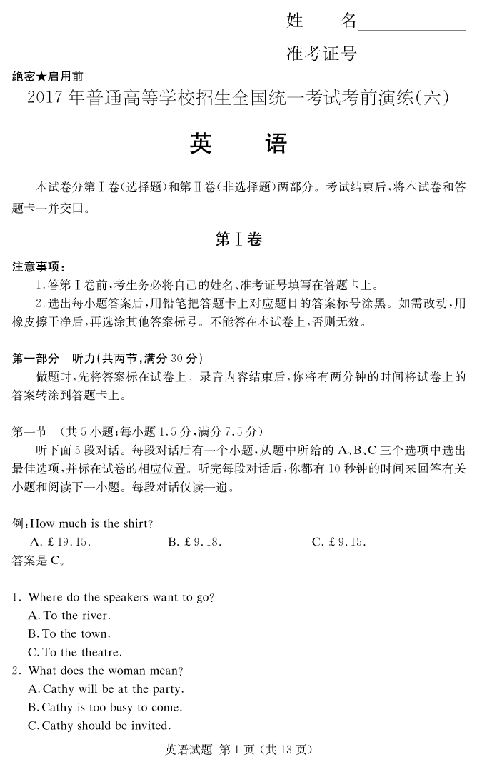 【英語】2017年普通高等學(xué)校招生全國統(tǒng)一考試考前演練(六)