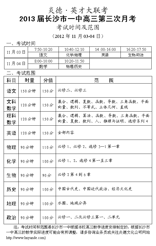 炎德英才大聯(lián)考長沙市一中2013屆高三第三次月考考試時間和范圍