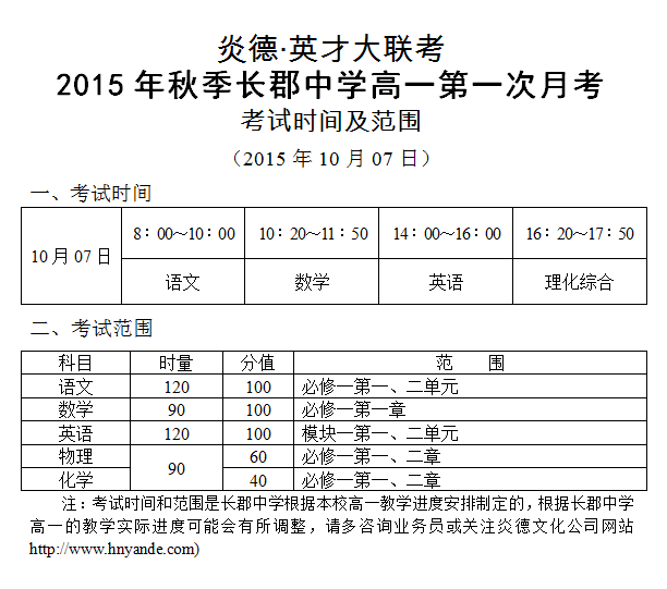 炎德英才大聯(lián)考2015年秋季長郡中學(xué)高一第一次月考考試時(shí)間和范圍(2015.10.07)