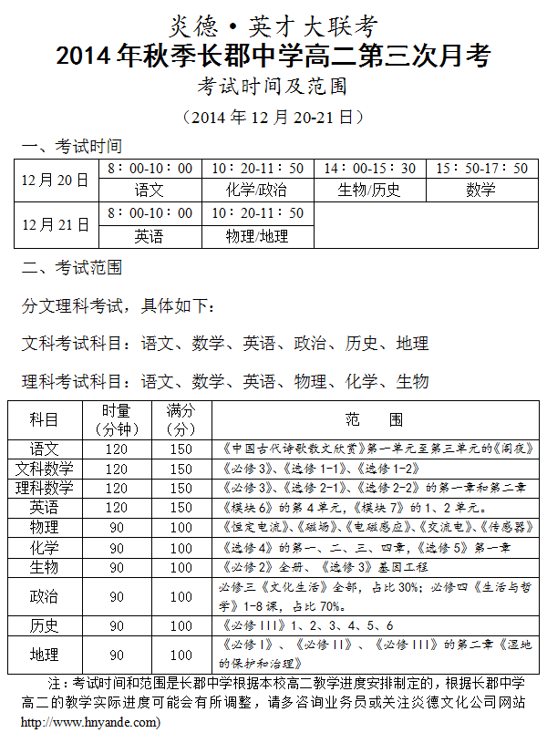 炎德英才大聯(lián)考2014年秋季長(zhǎng)郡中學(xué)高二第三次月考考試時(shí)間和范圍(2014.12.20-21)