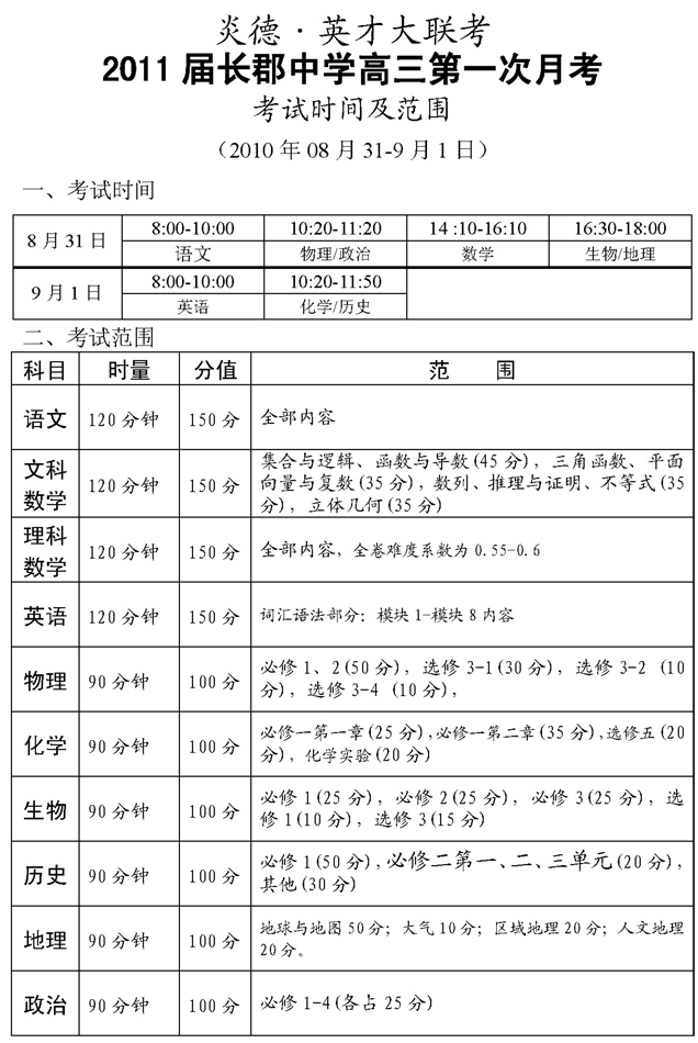 [含聽(tīng)力答題卡]炎德英才大聯(lián)考長(zhǎng)郡中學(xué)2012屆高三第一次月考考試時(shí)間和范圍