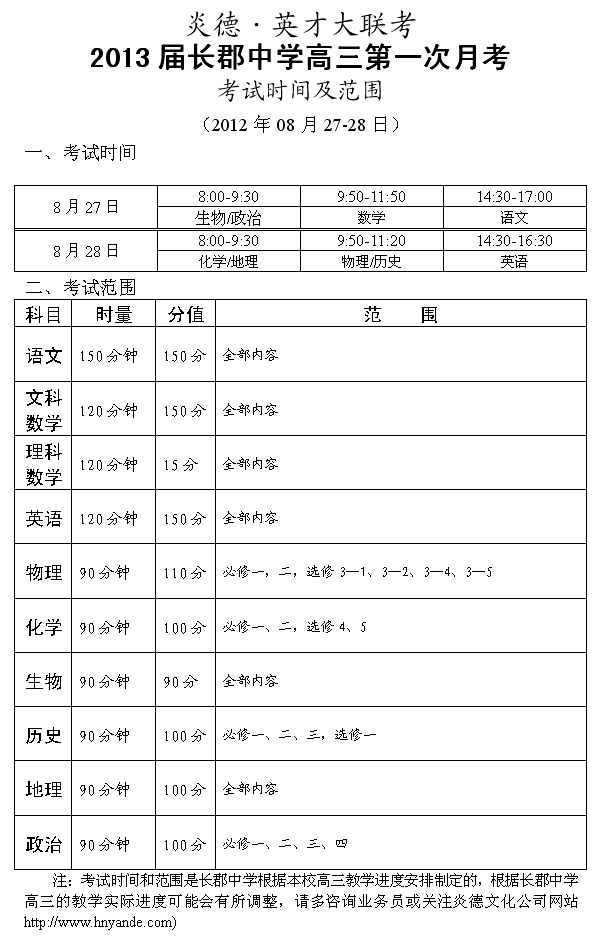 炎德英才大聯(lián)考長(zhǎng)郡中學(xué)2013屆高三第一次月考考試時(shí)間和范圍