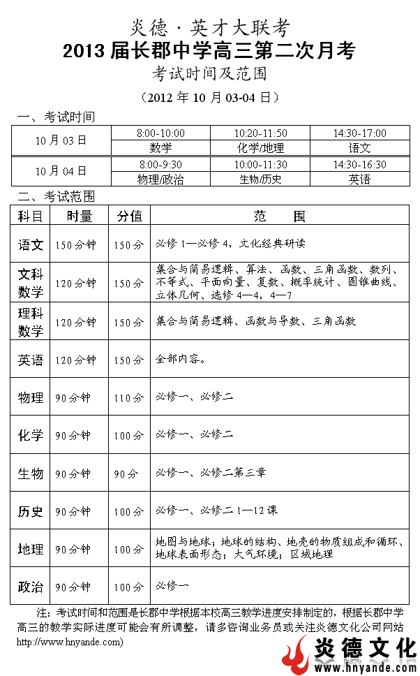 炎德英才大聯(lián)考長郡中學(xué)2013屆高三第二次月考考試時間和范圍
