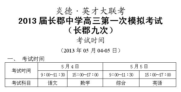炎德英才大聯(lián)考長郡中學(xué)2013屆高三第九次月考考試時間(2013年5月4-5日)