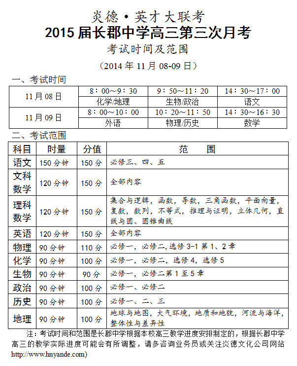 炎德英才大聯(lián)考長郡中學(xué)2015屆高三第3次月考考試時間和范圍(2014.11.08-09)