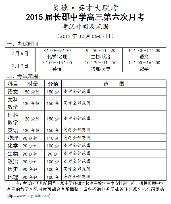 炎德英才大聯(lián)考長郡中學(xué)2015屆高三第6次月考考試時間和范圍(2015.02.06-07)