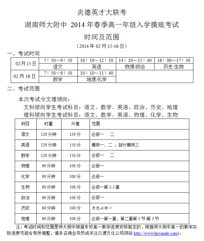2014年春季師大附中高一年級(jí)入學(xué)摸底考試時(shí)間及范圍(2014.02.15-16)