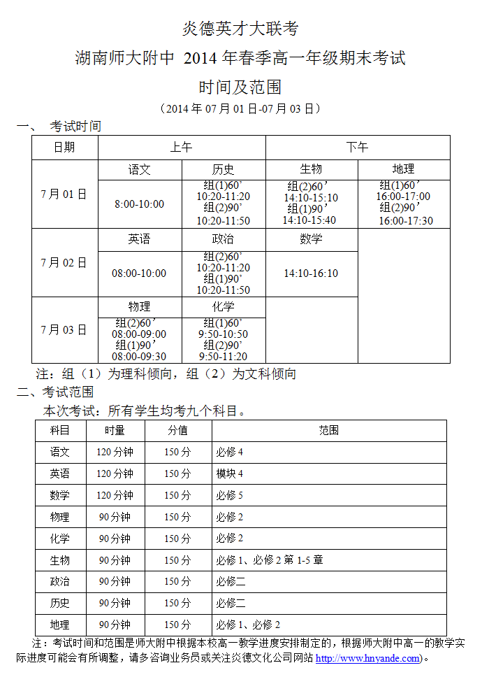 2014年春季師大附中高一期末考試(第四次月考)考試時間及范圍(2014.07.01-03)