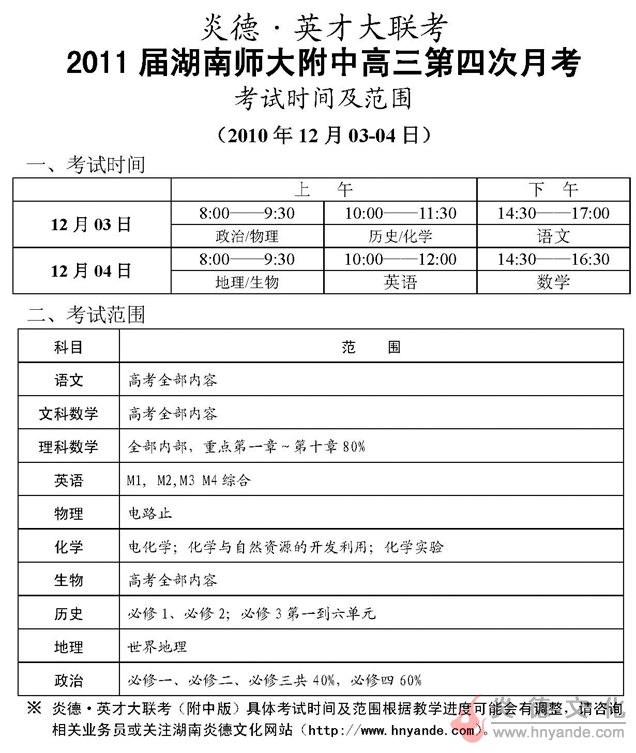 炎德英才大聯(lián)考湖南師大附中2011屆高三第四次月考考試時(shí)間和范圍