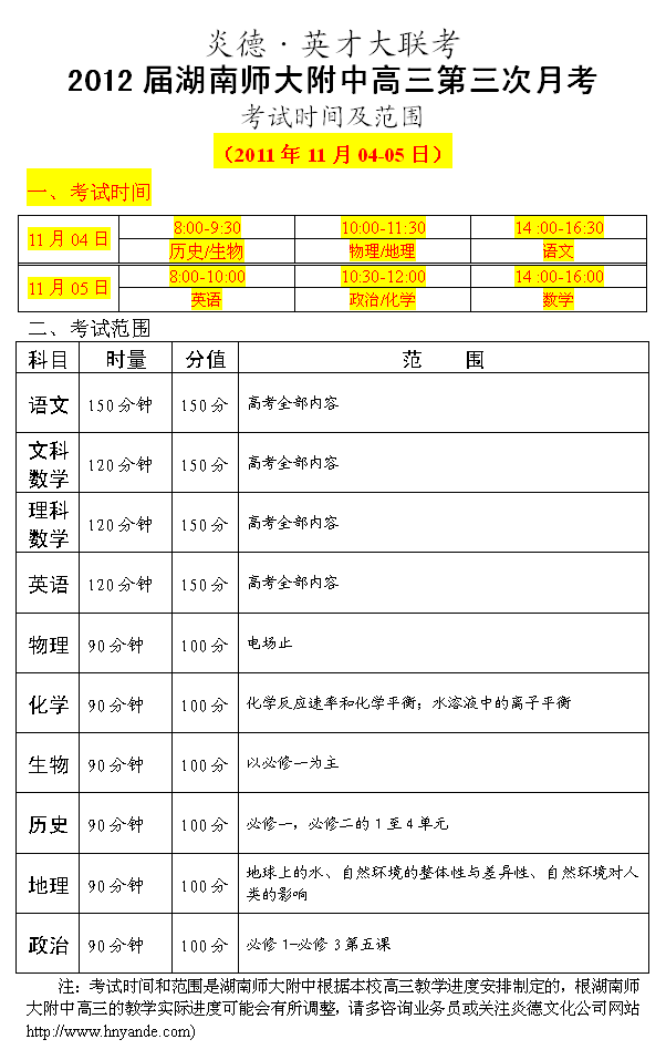 炎德英才大聯(lián)考湖南師大附中2012屆高三第三次月考考試時(shí)間和范圍