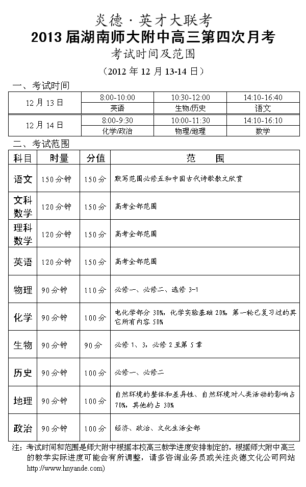 炎德英才大聯(lián)考師大附中2013屆高三第四次月考考試時間和范圍