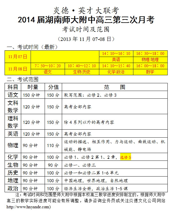 炎德英才大聯(lián)考師大附中2014屆高三第3次月考考試時(shí)間和范圍(2013.11.07-08)