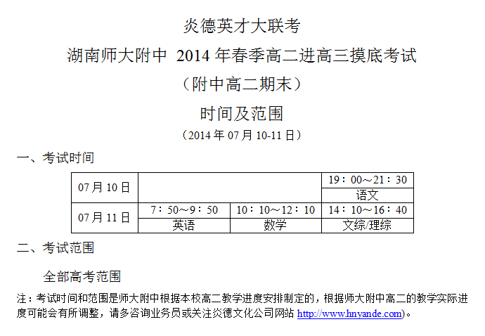 2014年春季師大附中高二期末考試(高二進(jìn)高三摸底)時(shí)間及范圍(2014.07.10-11)
