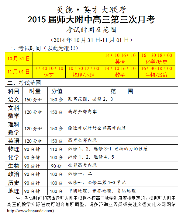 炎德英才大聯(lián)考師大附中2015屆高三第3次月考考試時(shí)間和范圍(2014.10.31-11.01)