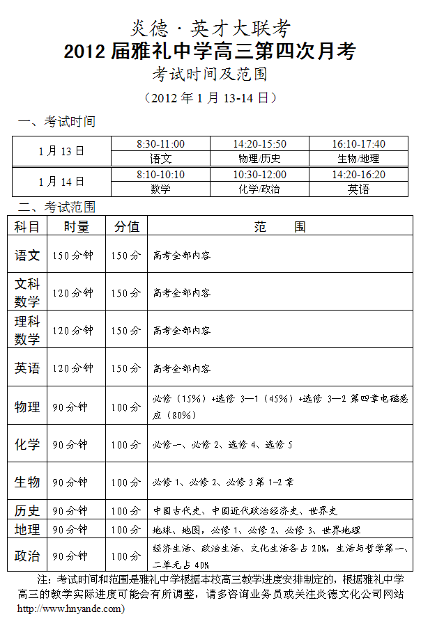 炎德英才大聯(lián)考雅禮中學(xué)2012屆高三第四次月考考試時(shí)間和范圍