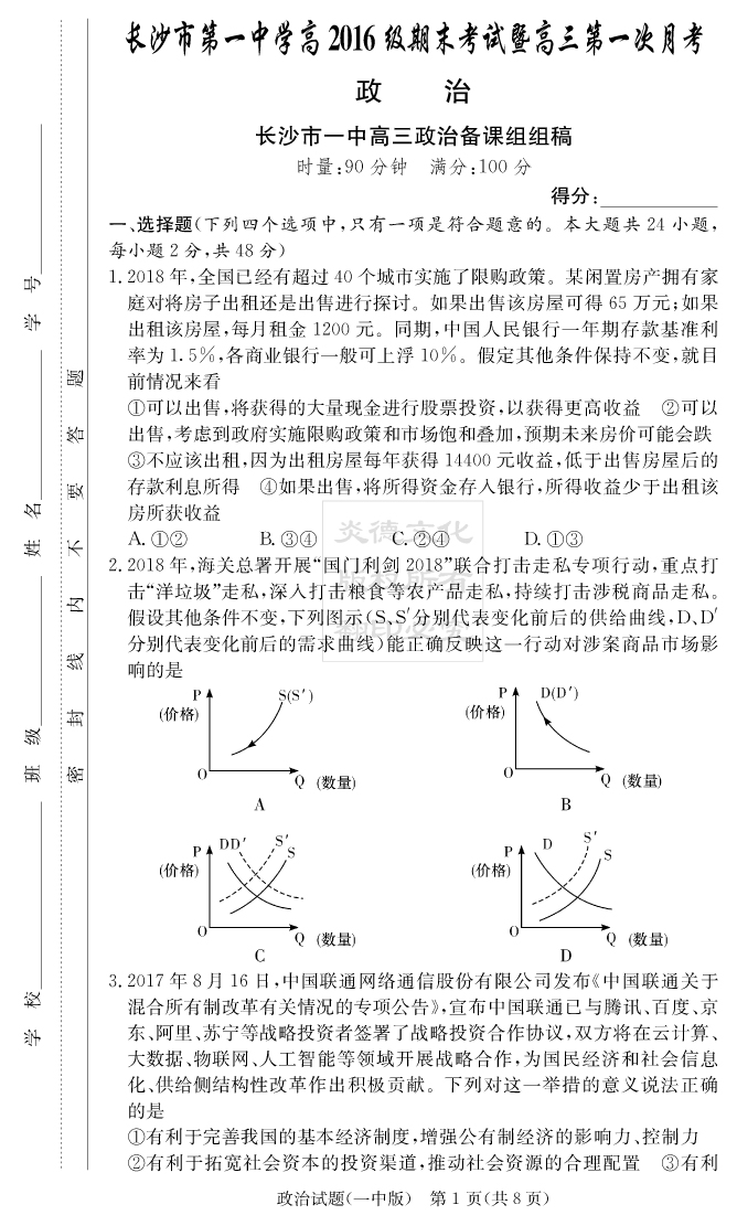 【政治】炎德英才大聯(lián)考2019長沙一中高三1次月考