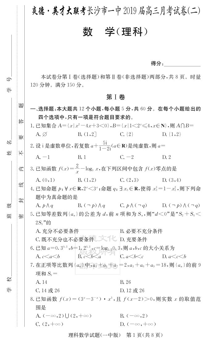 【理數(shù)】炎德英才大聯(lián)考2019長(zhǎng)沙一中高三2次月考