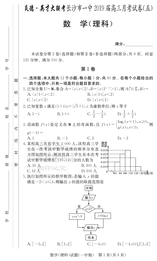 【理數(shù)】炎德英才大聯(lián)考2019長沙一中高三5次月考