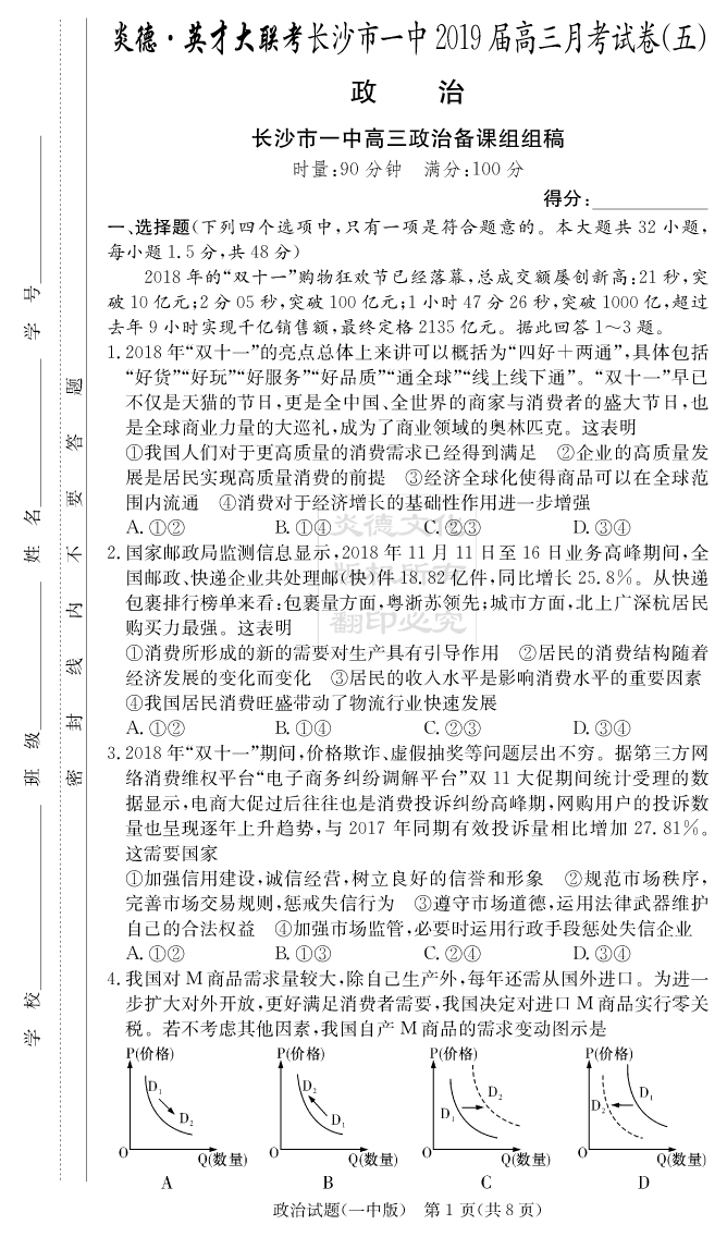 【政治】炎德英才大聯(lián)考2019長沙一中高三5次月考