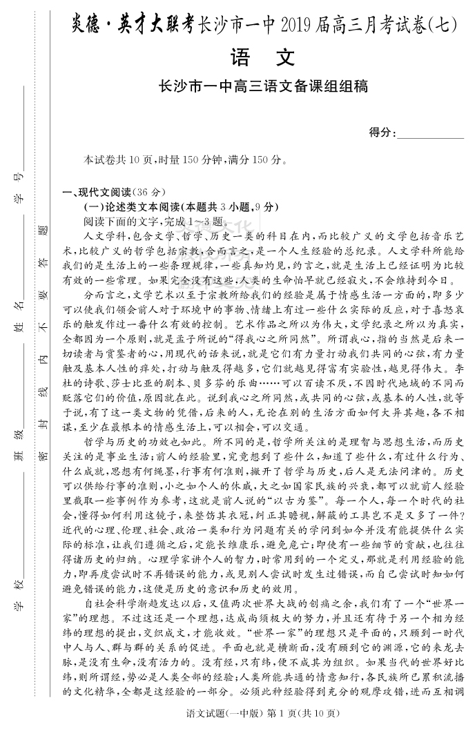 【語文】炎德英才大聯(lián)考2019長沙一中高三7次月考