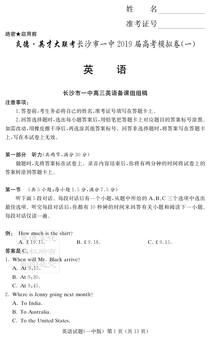 【英語(yǔ)】炎德英才大聯(lián)考2019長(zhǎng)沙一中高三10次月考(模擬一)