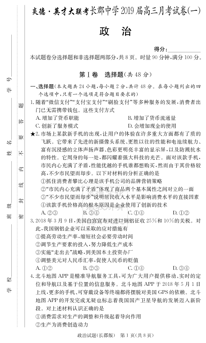 【政治】炎德英才大聯(lián)考2019長郡中學高三1次月考