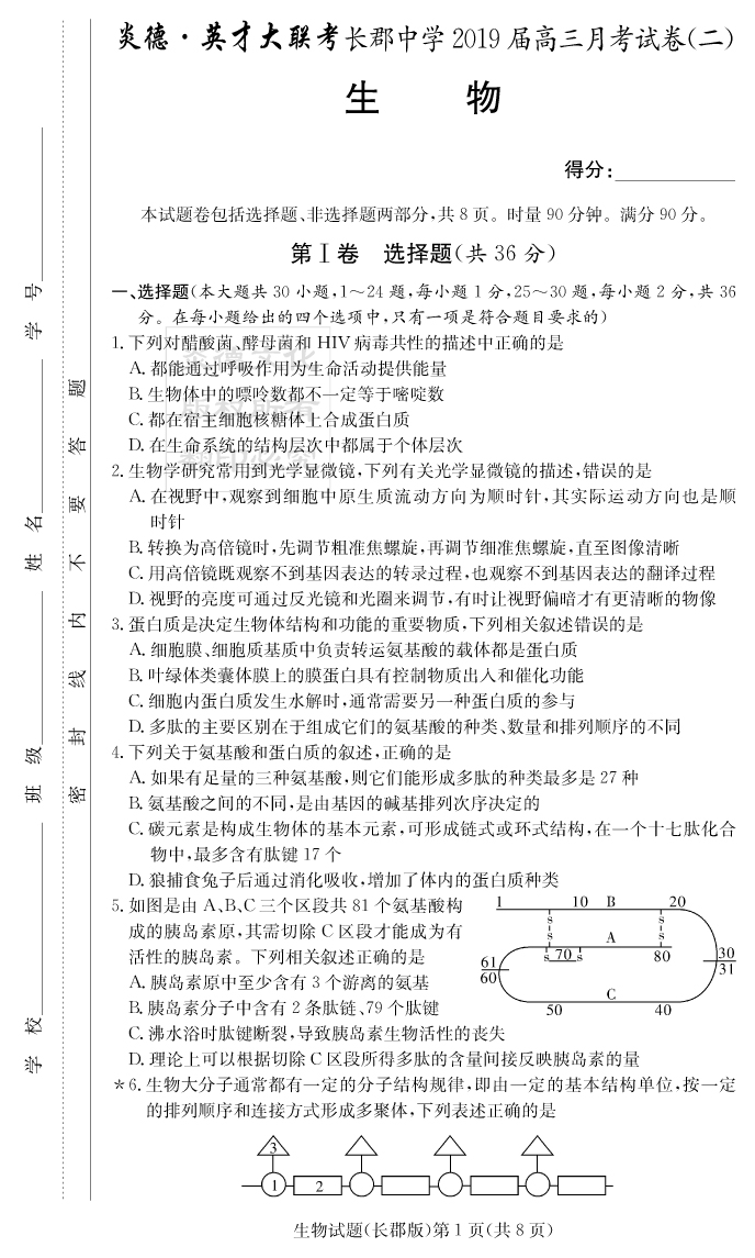 【生物】炎德英才大聯(lián)考2019長郡中學(xué)高三2次月考