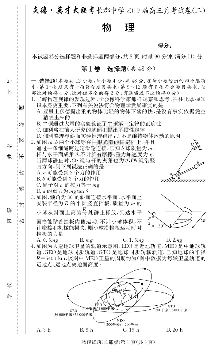 【物理】炎德英才大聯(lián)考2019長(zhǎng)郡中學(xué)高三2次月考