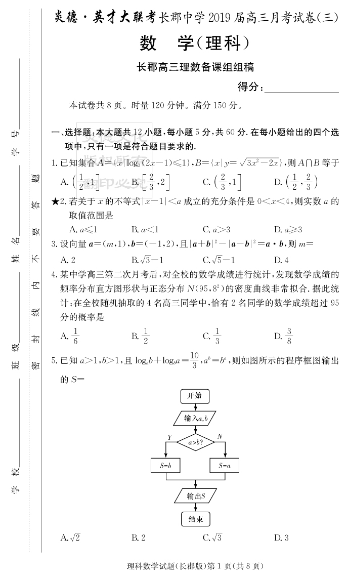 【理數(shù)】炎德英才大聯(lián)考2019長(zhǎng)郡中學(xué)高三3次月考