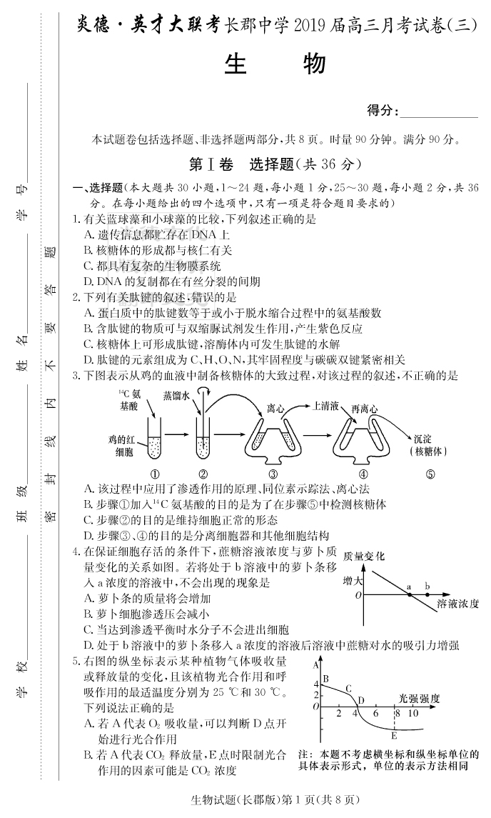 【生物】炎德英才大聯(lián)考2019長郡中學(xué)高三3次月考