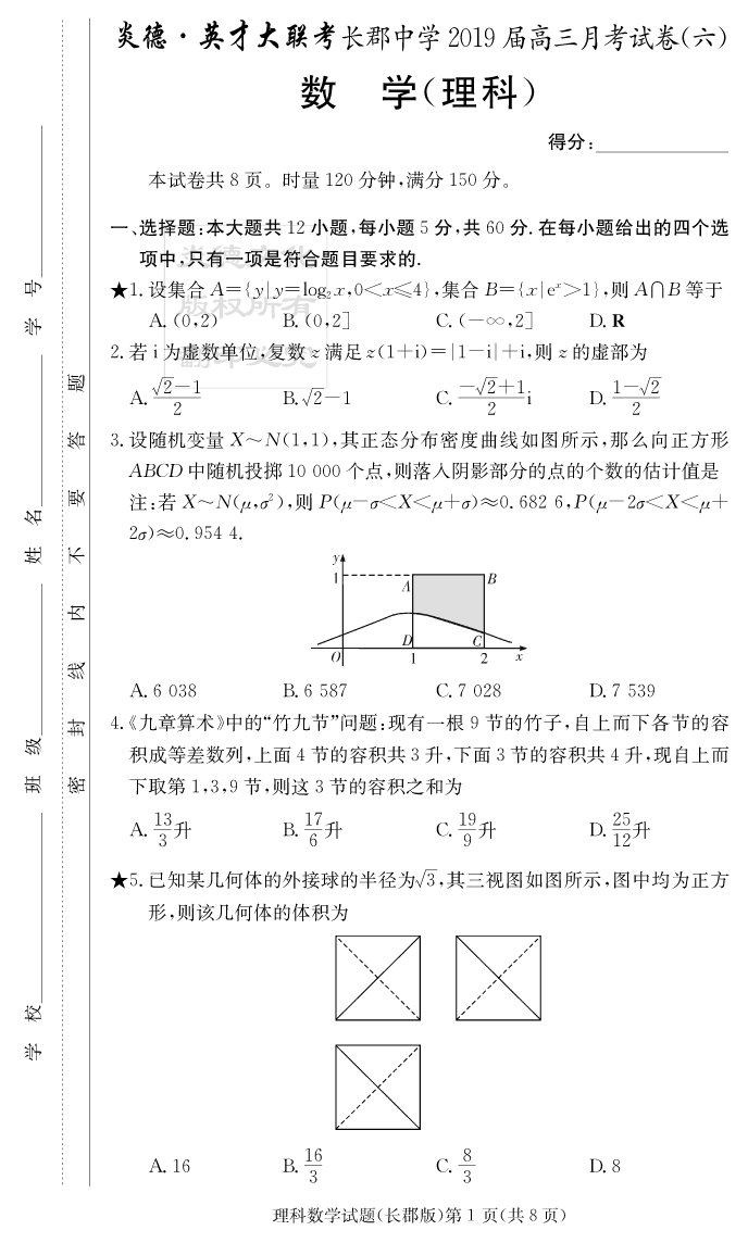 【理數(shù)】炎德英才大聯(lián)考2019長(zhǎng)郡中學(xué)高三6次月考