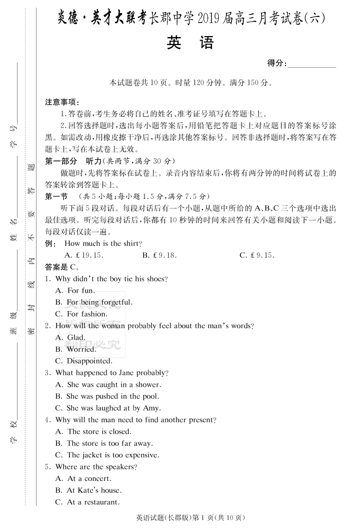 【英語】炎德英才大聯(lián)考2019長郡中學(xué)高三6次月考