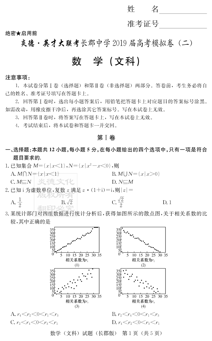 【文數(shù)】炎德英才大聯(lián)考2019長(zhǎng)郡中學(xué)高三10次月考(模擬二)