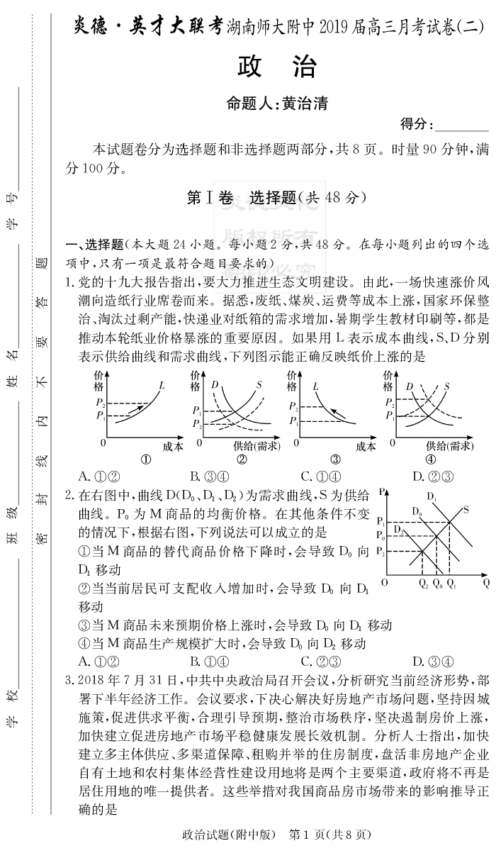 【政治】炎德英才大聯(lián)考2019師大附中高三2次月考