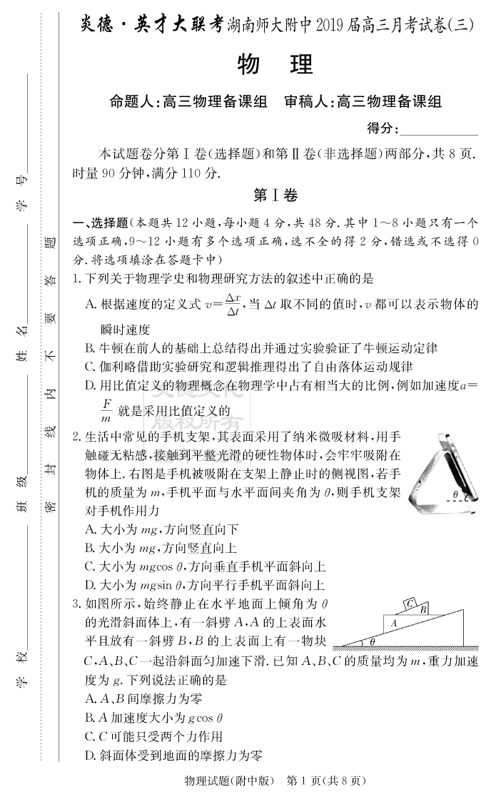 【物理】炎德英才大聯(lián)考2019師大附中高三3次月考