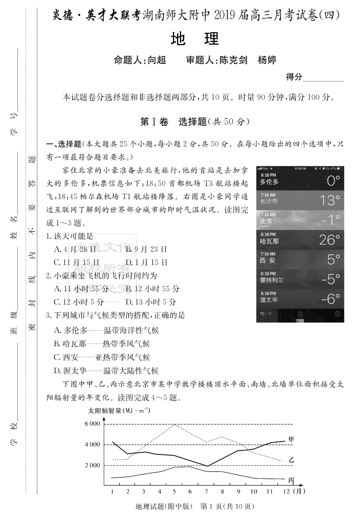 【地理】炎德英才大聯(lián)考2019師大附中高三4次月考