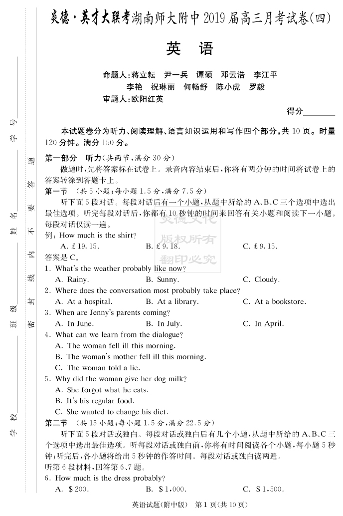 【英語】炎德英才大聯(lián)考2019師大附中高三4次月考