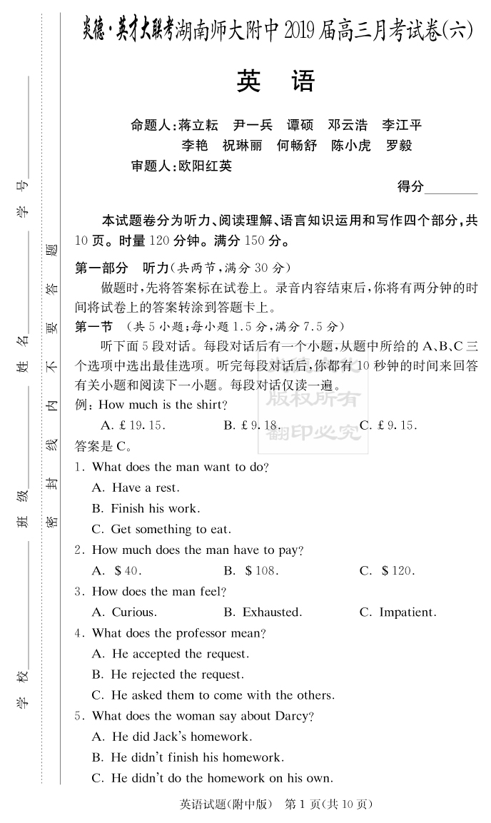 【英語(yǔ)】炎德英才大聯(lián)考2019師大附中高三6次月考