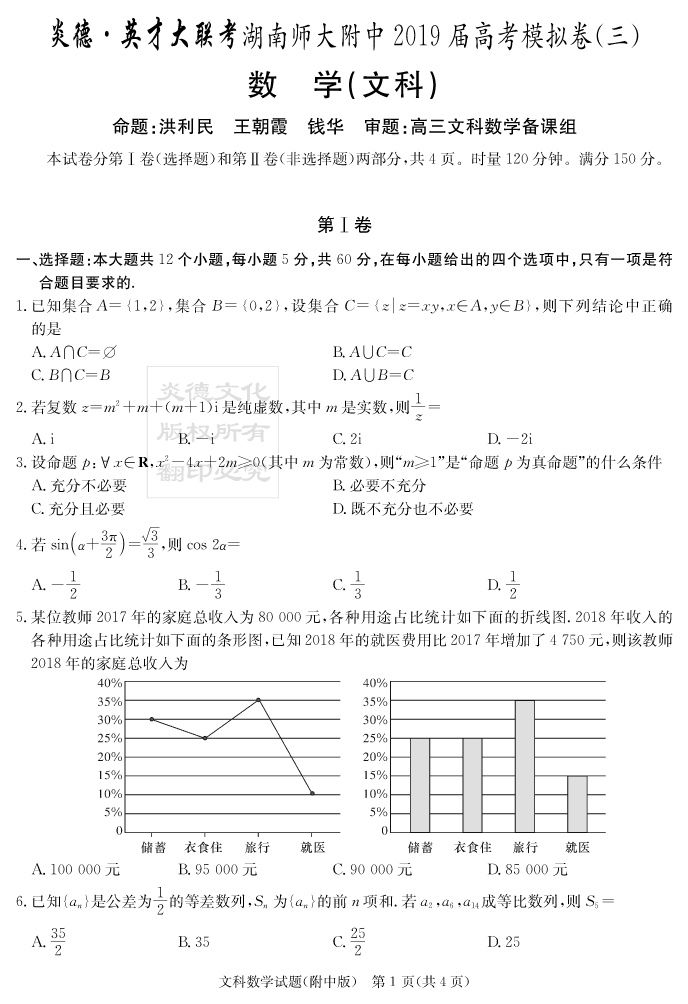【文數(shù)】炎德英才大聯(lián)考2019師大附中高三10次月考(模擬三)