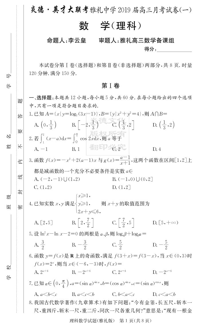 【理數(shù)】炎德英才大聯(lián)考2019雅禮中學(xué)高三1次月考