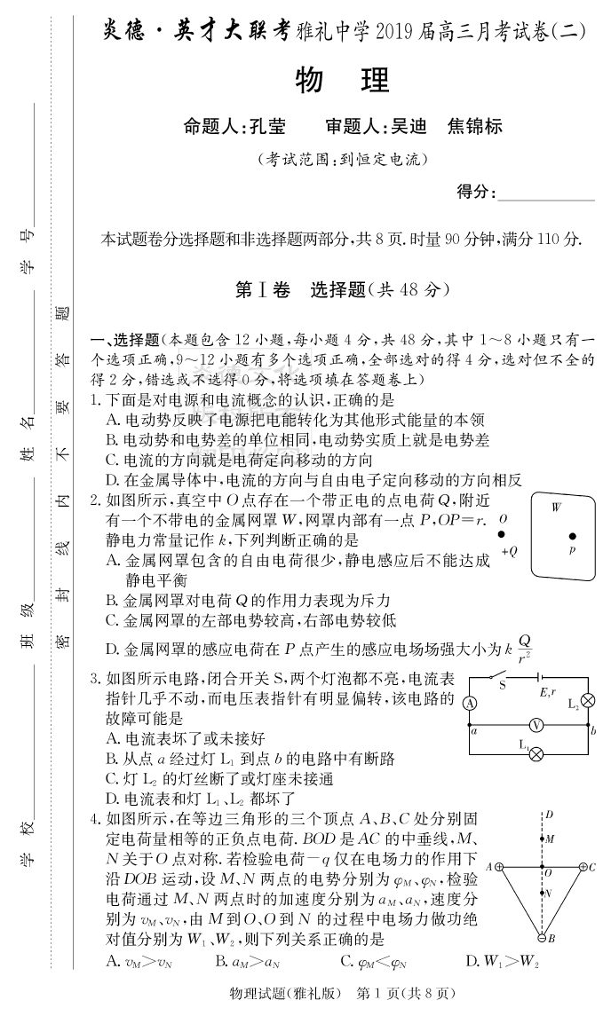 【物理】炎德英才大聯(lián)考2019雅禮中學(xué)高三2次月考