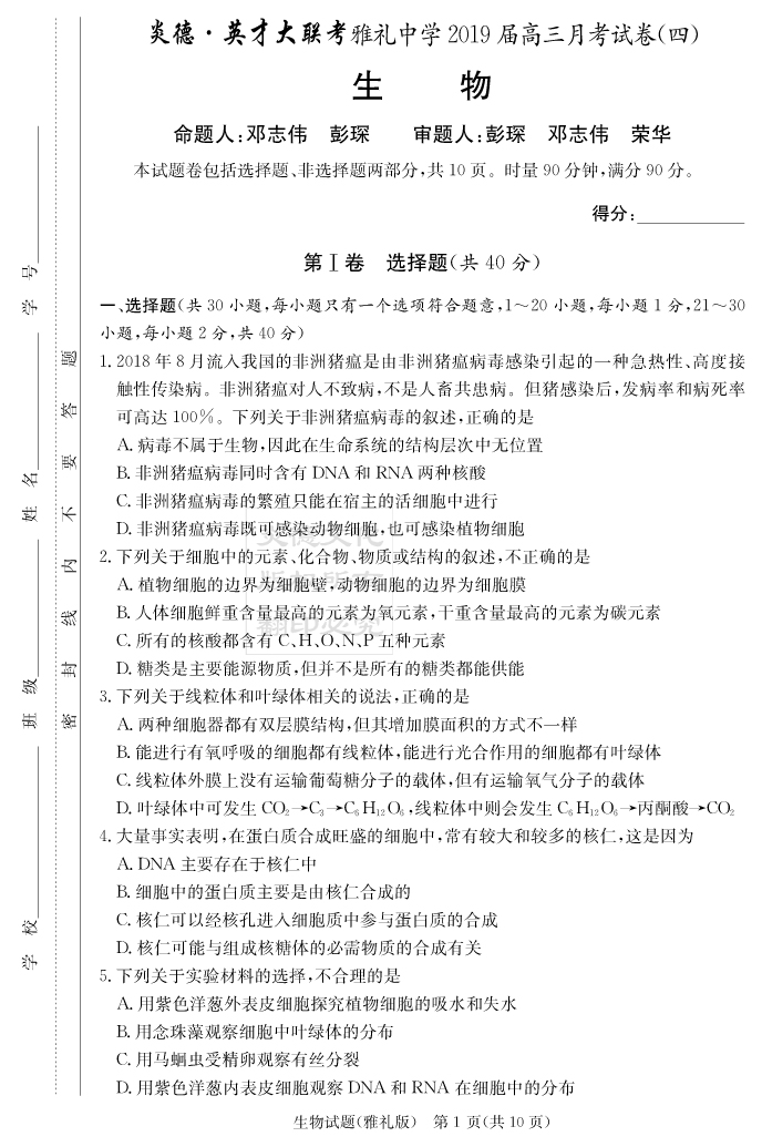【生物】炎德英才大聯(lián)考2019雅禮中學(xué)高三4次月考