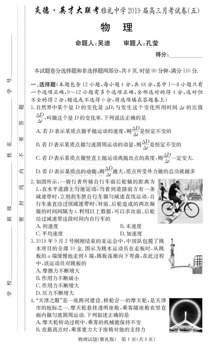 【物理】炎德英才大聯(lián)考2019雅禮中學(xué)高三5次月考