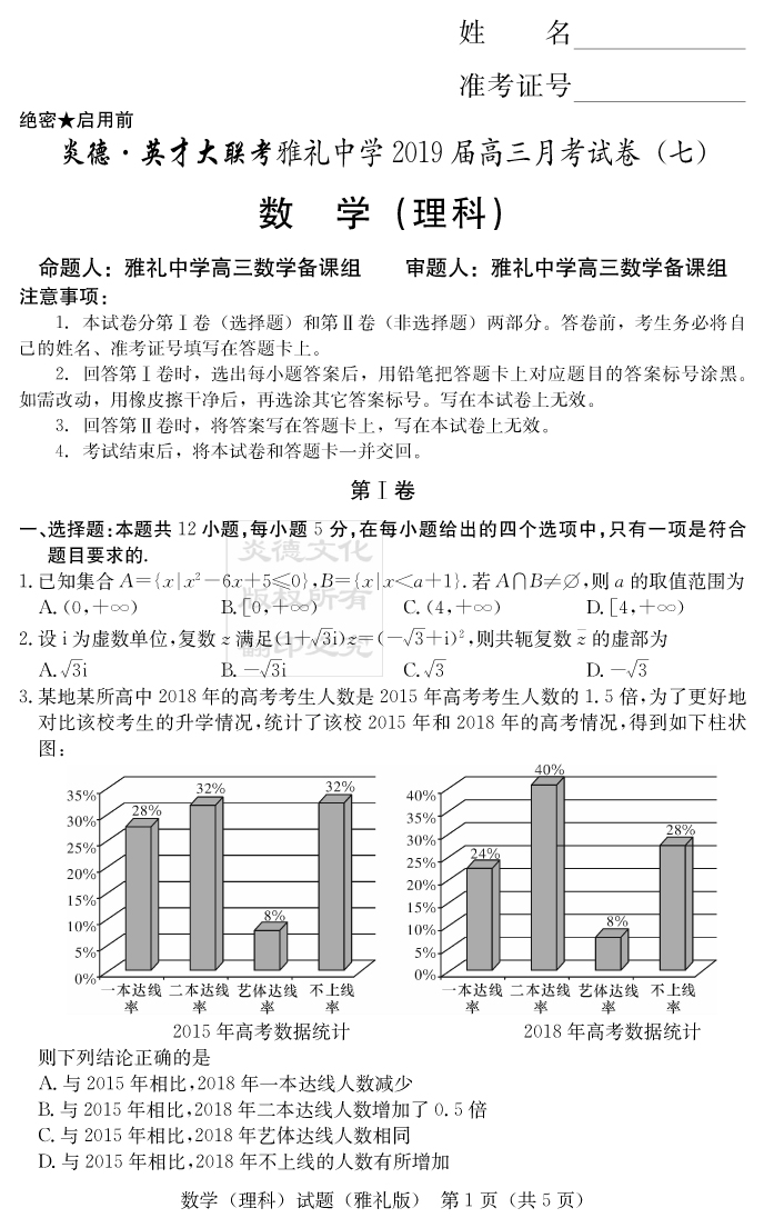 【理數(shù)】炎德英才大聯(lián)考2019雅禮中學高三7次月考